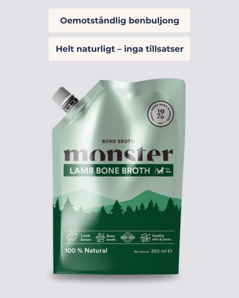 Innehåll: 4 olika varianter med ben från nöt, fisk, lamm, och anka – varsamt kokade för att bevara smak och näring.