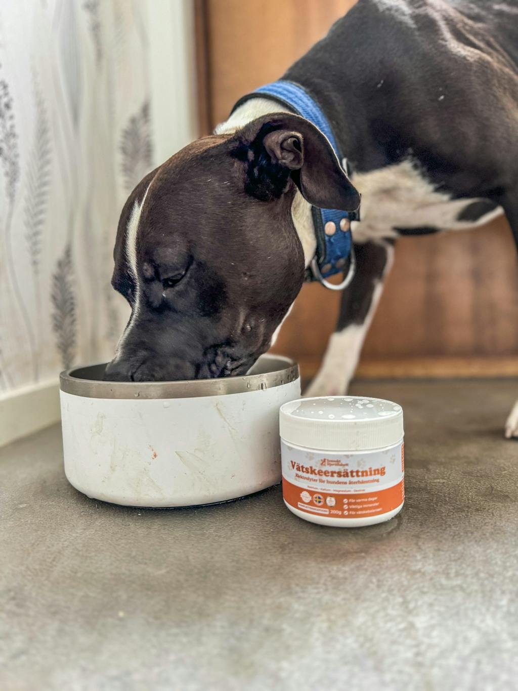 Möt Svenskt Djurtillskott Vätskeersättning, ett enkelt pulver fyllt av mineraler och elektrolyter för hundens återhämtning.